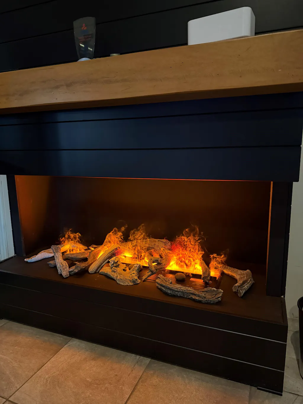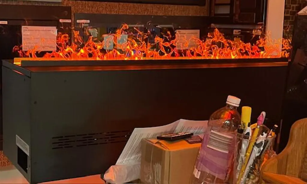 Aquafire® is type of electric fireplace powered by water that uses ultrasonic technology to create a fine mist that mimics the appearance of flames and smoke. These fireplaces do not produce actual flames, but instead, they create a realistic-looking flame effect using LED lights and water vapor.